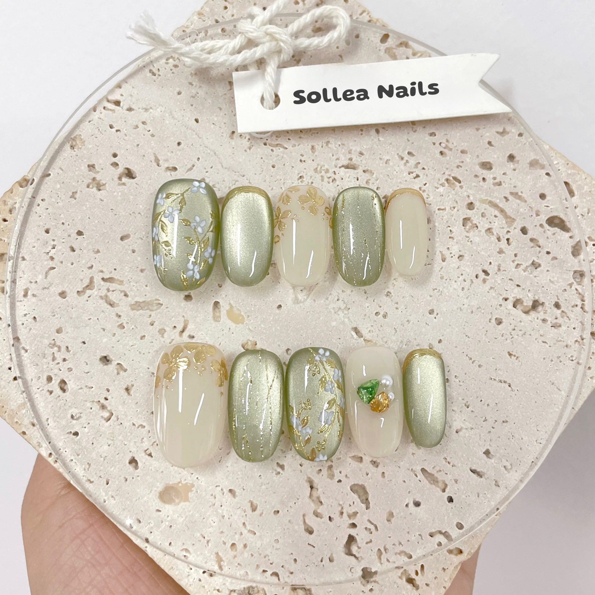 Green, beige, and gold press-ons with metallic finishes, floral accents, and gemstone details. Earthy, elegant, reusable.