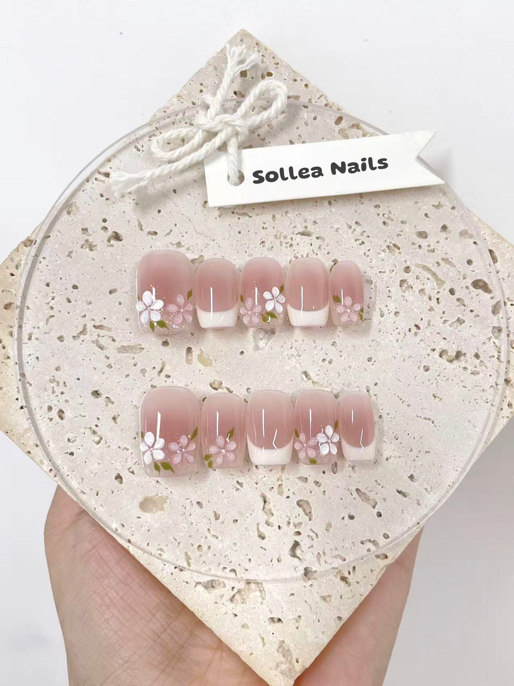 Soft pink french press‑ons with delicate white and pink floral accents. Fresh, feminine, reusable, perfect for a romantic look with a classic twist.