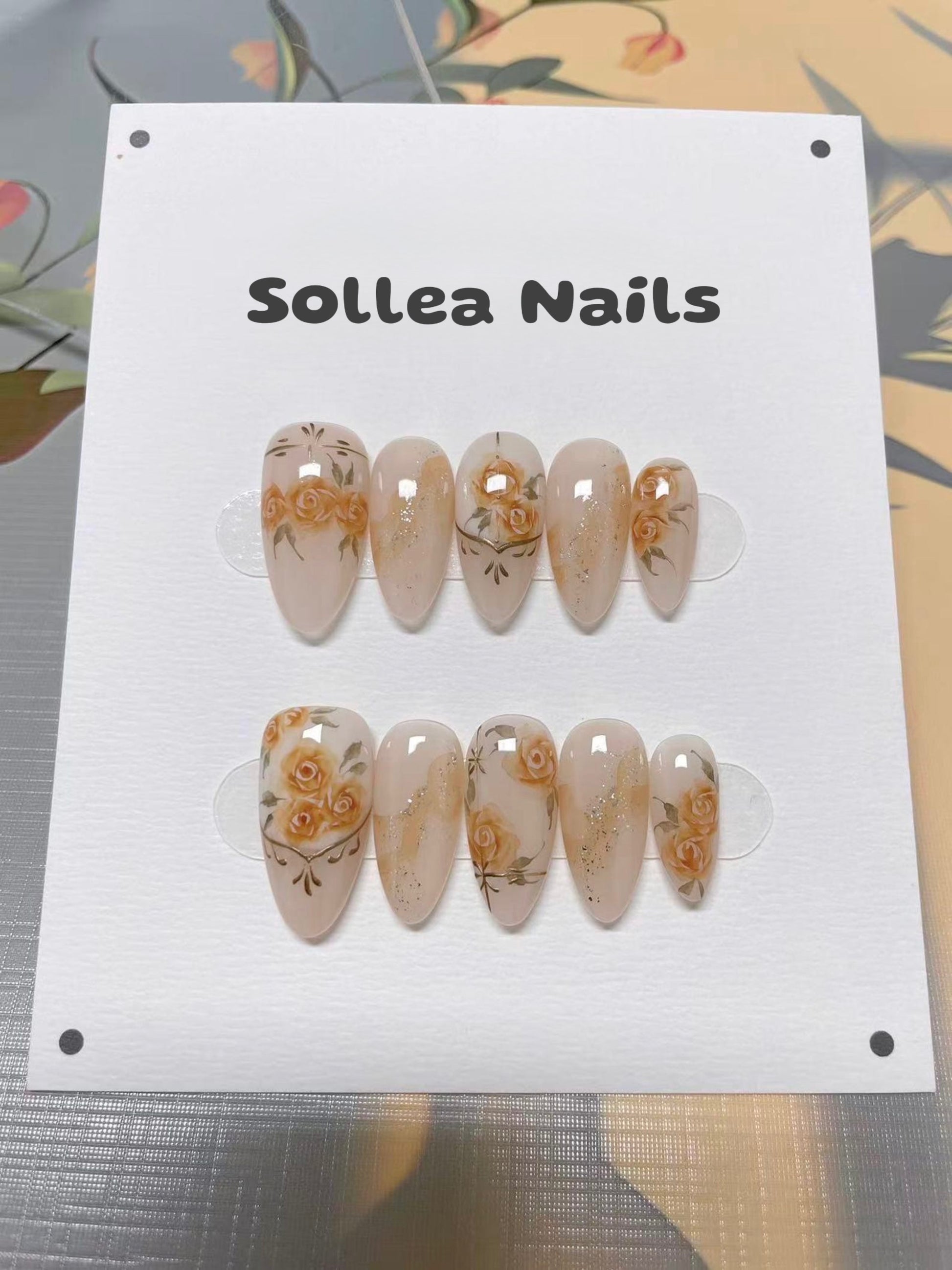 Glossy nude nails adorned with hand-painted apricot-orange roses, green leaves, and subtle gold glitter accents. A warm, vintage-inspired floral design perfect for everyday charm with artistic finesse.