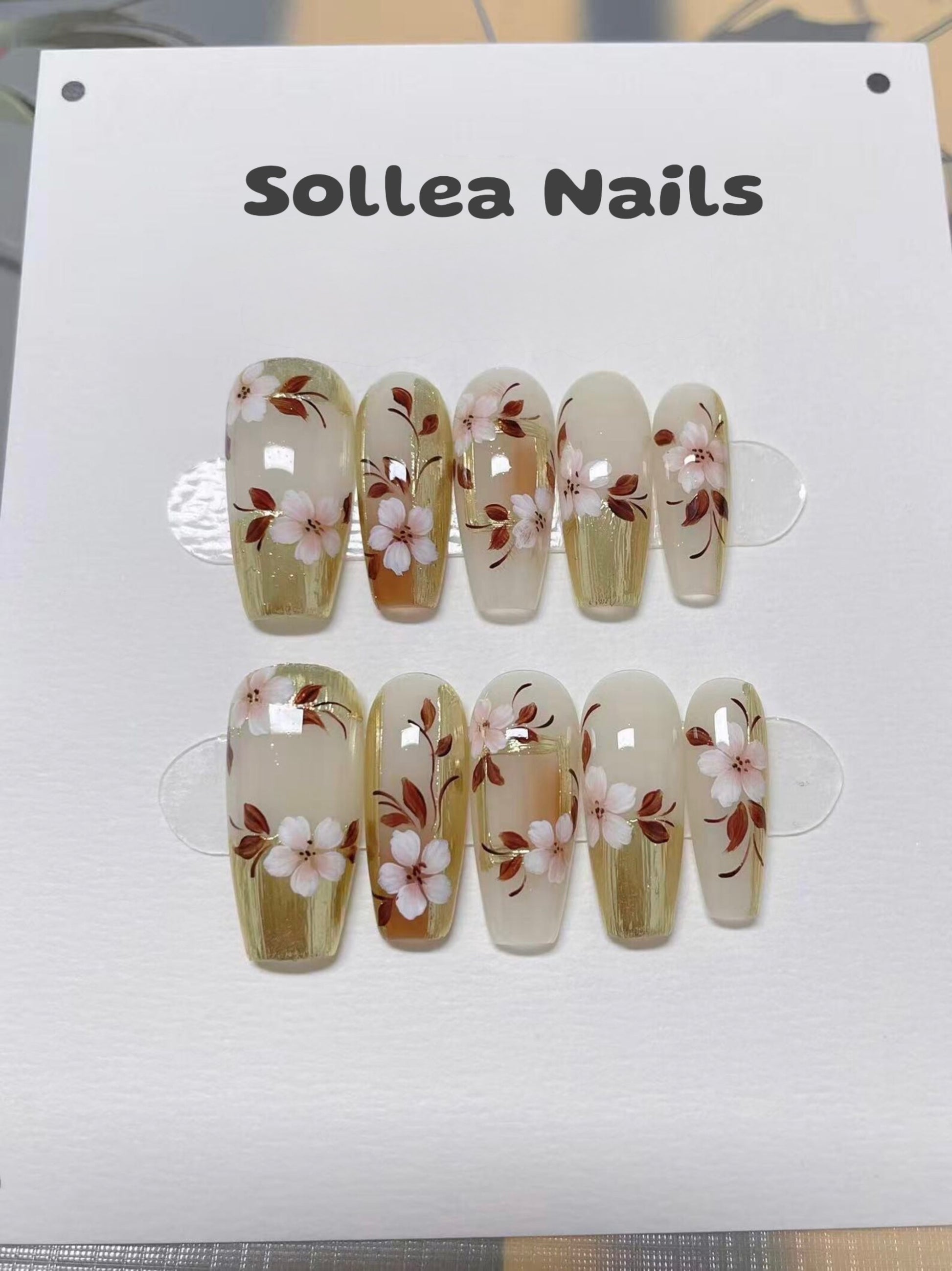 Translucent nails with white and pink florals, brown leaves, and soft gold-beige accents for a graceful, earthy elegance
