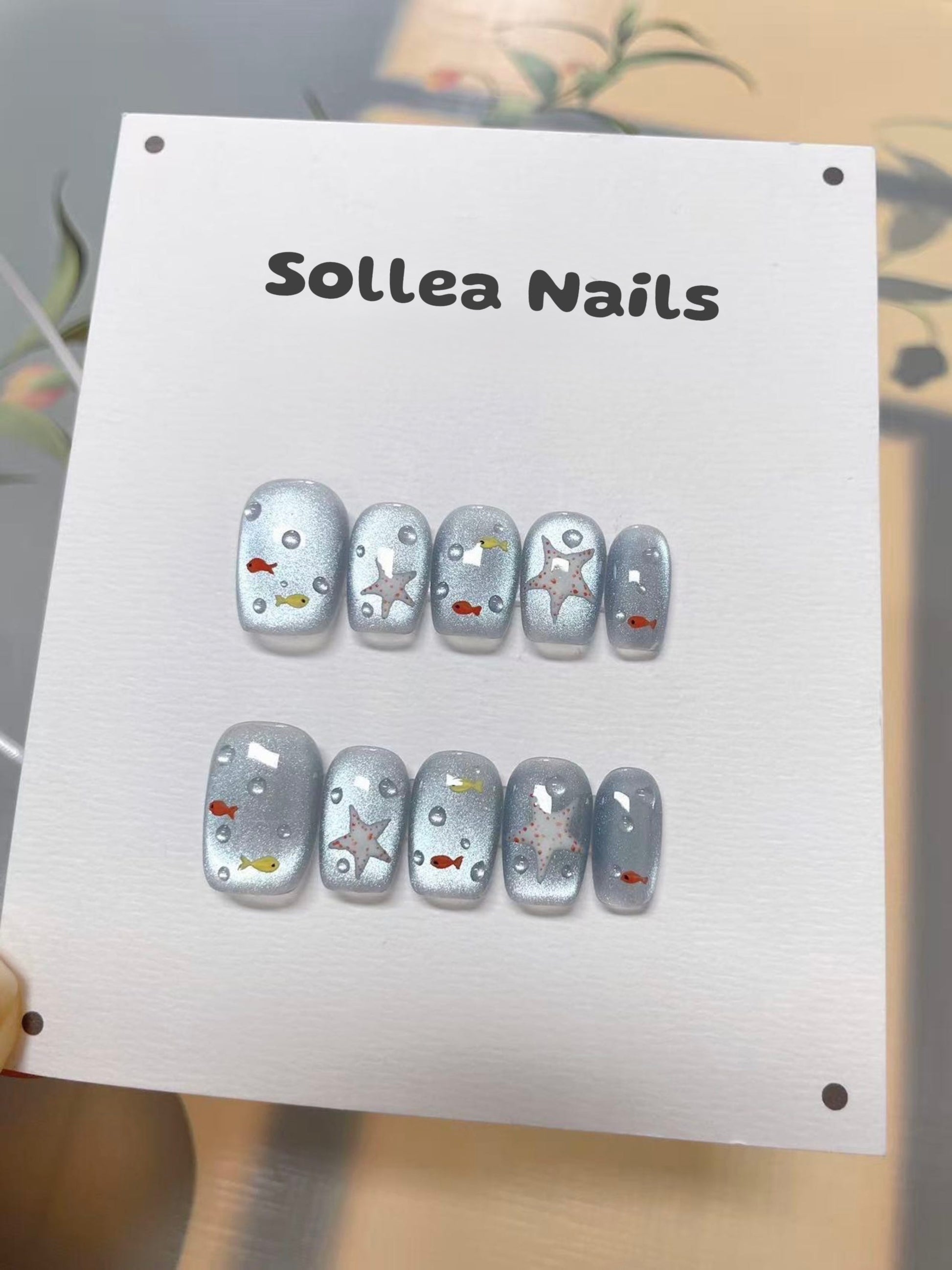 Metallic light blue nails with hand-painted aquatic motifs - red and yellow fish, starfish, and bubble accents for a playful vibe