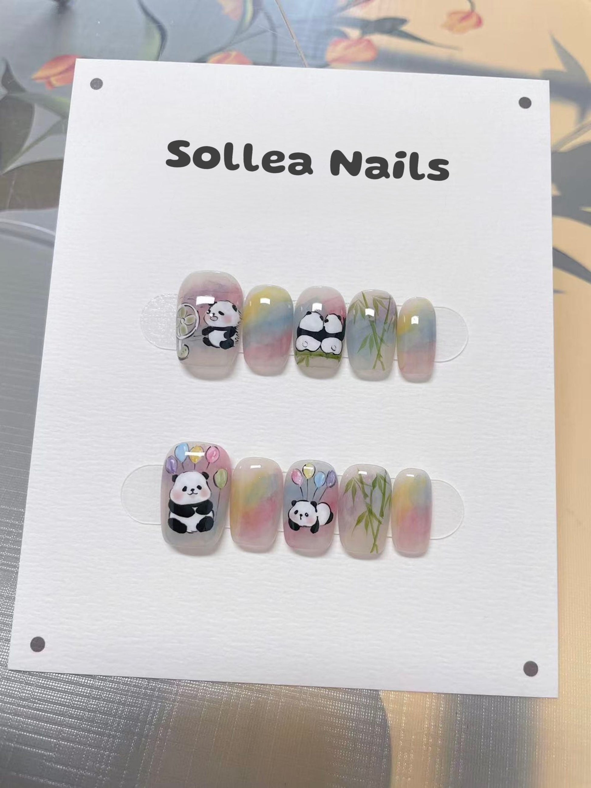 Pastel nails with hand-painted pandas, bamboo, balloons, and abstract accents for a playful, storybook charm