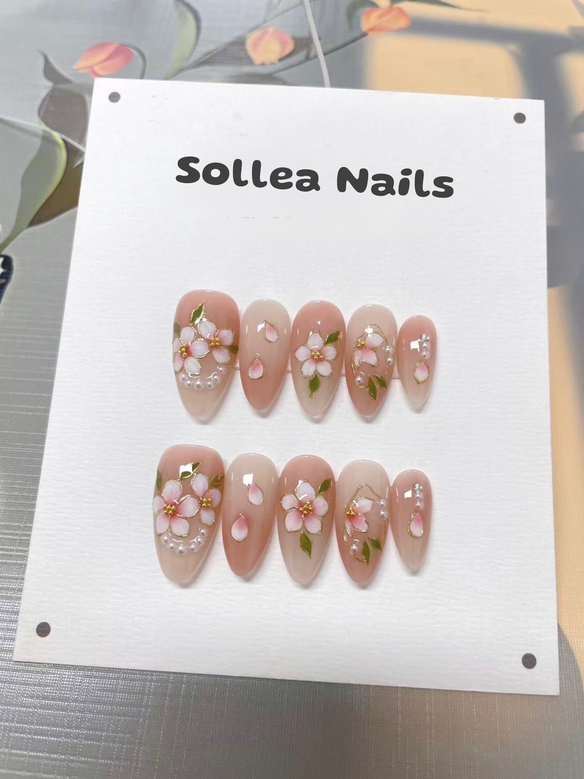 Soft nude nails with white and pink florals, green leaves, pearl accents, and gold detailing for a graceful, romantic finish
