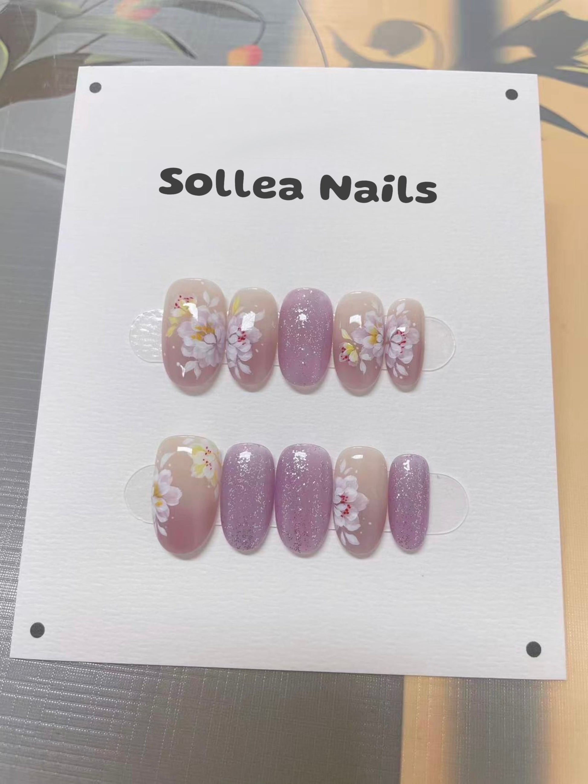 Soft pink and purple press‑ons with white‑yellow florals and subtle glitter. Sweet, feminine, reusable, perfect for a fresh, spring‑inspired look.